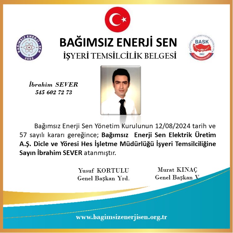 Elektrik Üretim Anonim Şirketi Dicle ve Yöresi HES İşletme Müdürlüğünde etkin görev alarak bağımsız sendikacılık konusunda sendikamız adına faaliyet yürütmek üzere Elektrik Üretim Anonim Şirketi Dicle ve Yöresi HES İşletme Müdürlüğünde çalışmakta olan değerli üyemiz İbrahim SEVER; Bağımsız Enerji Sen Yönetim Kurulunun 12 Ağustos 2024 tarih ve 57 sayılı kararı ile Bağımsız Enerji Sen Elektrik Üretim Anonim Şirketi Dicle ve Yöresi HES İşletme Müdürlüğü İşyeri Temsilcisi olarak atanmıştır.