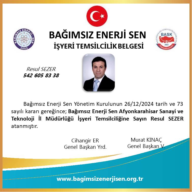 Sendikamız adına Afyonkarahisar Sanayi ve Teknoloji İl Müdürlüğünde sendikal faaliyetleri yürütmek üzere, Sendika İşyeri Temsilcisi olarak Resul SEZER yetkilendirilmiştir.