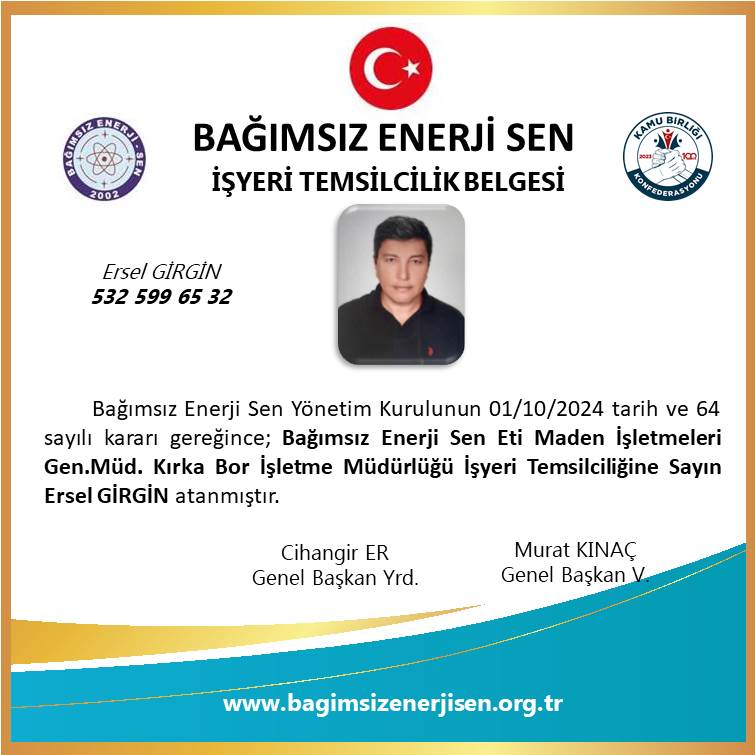 Eti Maden İşletmeleri Genel Müdürlüğü Kırka Bor İşletme Müdürlüğünde etkin görev alarak bağımsız sendikacılık konusunda sendikamız adına faaliyet yürütmek üzere Eti Maden İşletmeleri Genel Müdürlüğü Kırka Bor İşletme Müdürlüğünde çalışmakta olan değerli üyemiz Ersel GİRGİN; Bağımsız Enerji Sen Yönetim Kurulunun 1 Ekim 2024 tarih ve 64 sayılı kararı ile Bağımsız Enerji Sen Eti Maden İşletmeleri Genel Müdürlüğü Kırka Bor İşletme Müdürlüğü İşyeri Temsilcisi olarak atanmıştır.