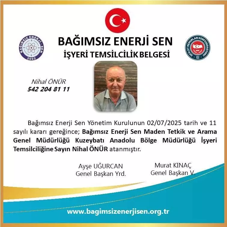 MTA Genel Müdürlüğü Kuzeybatı Anadolu Bölge Müdürlüğünde etkin görev alarak bağımsız sendikacılık konusunda sendikamız adına faaliyet yürütmek üzere MTA Genel Müdürlüğü Kuzeybatı Anadolu Bölge Müdürlüğünde Elektronik Teknikeri olarak çalışmakta olan değerli üyemiz Nihal ÖNÜR; Bağımsız Enerji Sen Yönetim Kurulunun 2 Temmuz 2025 tarih ve 11 sayılı kararı ile Bağımsız Enerji Sen MTA Genel Müdürlüğü Kuzeybatı Anadolu Bölge Müdürlüğü İşyeri Temsilcisi olarak atanmıştır.
