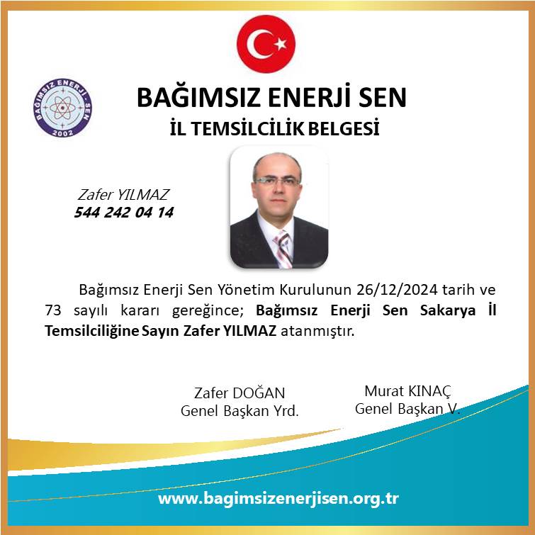 Bağımsız Enerji Sen Sakarya İl Temsilcimiz Zafer YILMAZ atanmıştır.