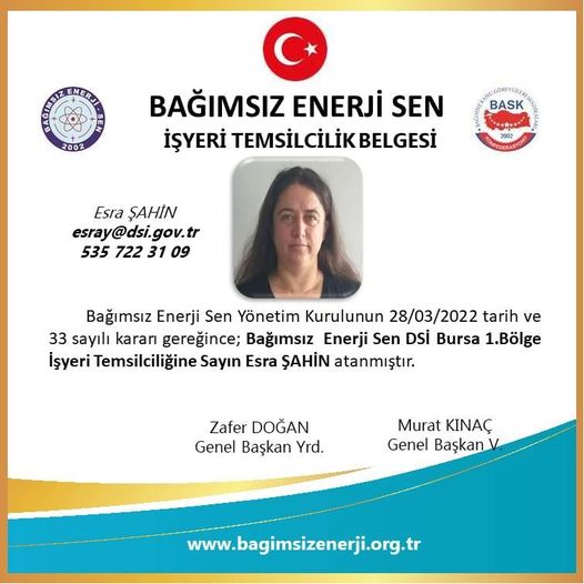 Bursa ili Merkez İlçesinde Devlet Su İşleri Genel Müdürlüğü bünyesinde faaliyet yürüten DSİ 1. Bölge Müdürlüğünde sendikamız adına etkin görev alarak başarı ile temsil eden değerli üyemiz Esra ŞAHİN; Bağımsız Enerji Sen Yönetim Kurulunun 28 Mart 2022 tarih ve 33 sayılı kararı ile DSİ 1. Bölge Müdürlüğü Sendika İşyeri Temsilcisi olarak atanmıştır.