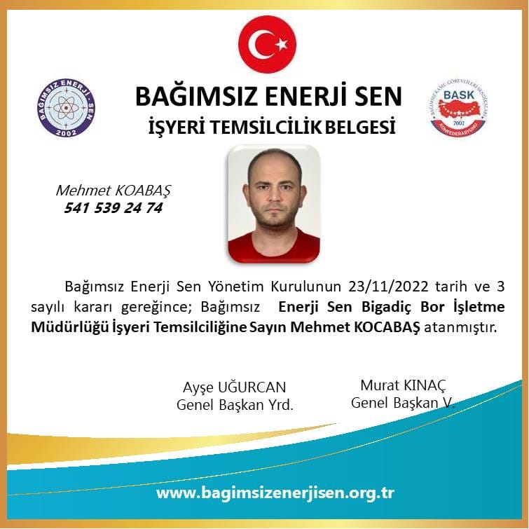 Eti Maden İşletmeleri Genel Müdürlüğü Bigadiç Bor İşletmesi bünyesinde etkin görev alarak bağımsız sendikacılık konusunda sendikamız adına faaliyet yürütmek üzere değerli üyemiz Mehmet KOCABAŞ; Bağımsız Enerji Sen Yönetim Kurulunun 23 Kasım 2022 tarih ve 3 sayılı kararı ile Bağımsız Enerji Sen Bigadiç Bor İşletme Müdürlüğü İşyeri Temsilcisi olarak atanmıştır.