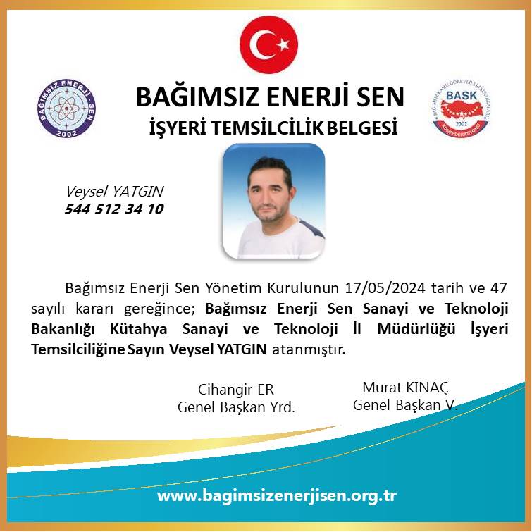 Sanayi ve Teknoloji Bakanlığı Kütahya Sanayi ve Teknoloji İl Müdürlüğünde etkin görev alarak bağımsız sendikacılık konusunda sendikamız adına faaliyet yürütmek üzere Sanayi ve Teknoloji Bakanlığı Kütahya Sanayi ve Teknoloji İl Müdürlüğünde çalışmakta olan değerli üyemiz Veysel YATGIN; Bağımsız Enerji Sen Yönetim Kurulunun 17 Mayıs 2024 tarih ve 47 sayılı kararı ile Bağımsız Enerji Sen Sanayi ve Teknoloji Bakanlığı Kütahya Sanayi ve Teknoloji İl Müdürlüğü İşyeri Temsilcisi olarak atanmıştır.