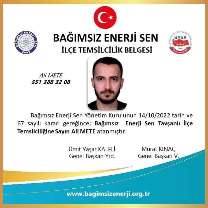 Türkiye Kömür İşletmeleri Kurumu Garp Linyit İşletmesi bünyesinde etkin görev alarak bağımsız sendikacılık konusunda sendikamız adına faaliyet yürütmek üzere değerli üyemiz Ali METE; Bağımsız Enerji Sen Yönetim Kurulunun 14 Ekim 2022 tarih ve 67 sayılı kararı ile Bağımsız Enerji Sen Tavşanlı İlçe Temsilcisi olarak atanmıştır.
