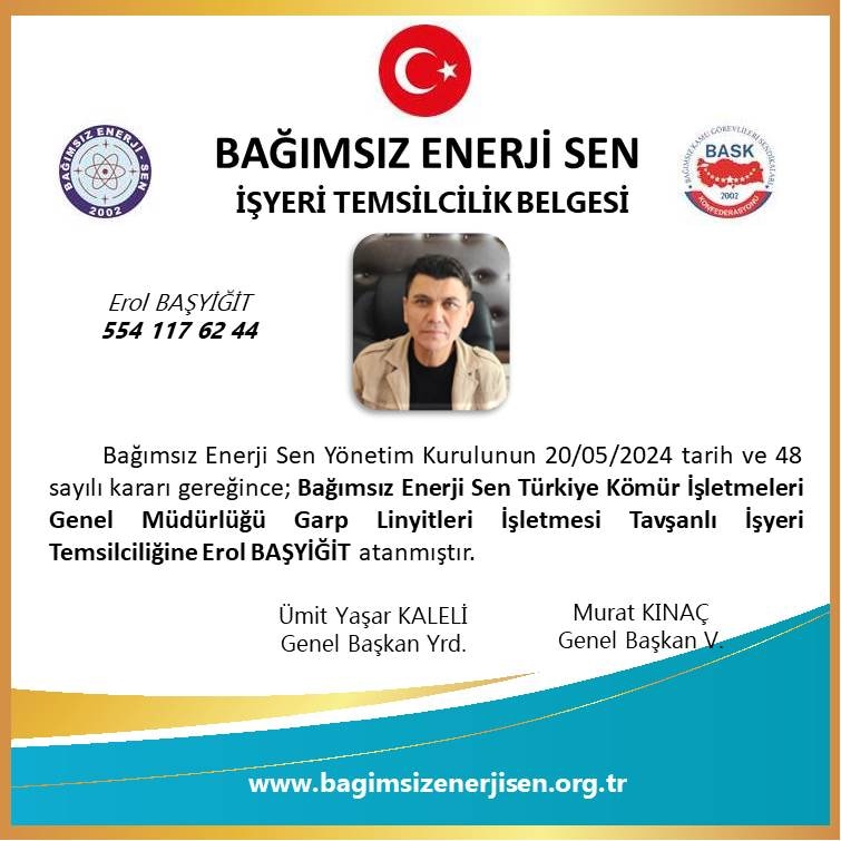 Türkiye Kömür İşletmeleri Kurumu Garp Linyit İşletmesi Müdürlüğünde Sendikamız adına sendikal faaliyetleri yürütmek üzere, Sendika İşyeri Temsilcisi olarak Erol BAŞYİĞİT yetkilendirilmiştir.