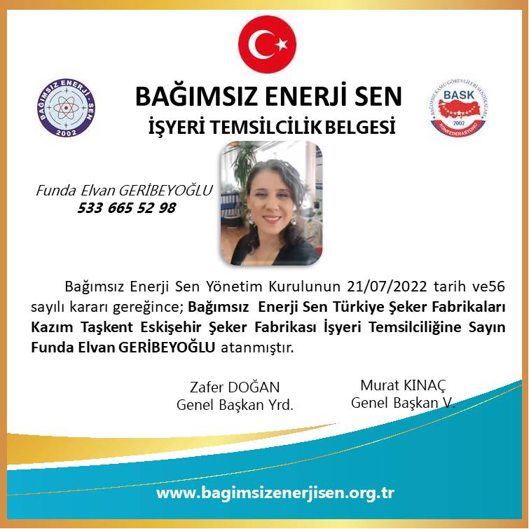 Türkiye Şeker Fabrikaları A.Ş. Kazım Taşkent Eskişehir Şeker Fabrikasında etkin görev alarak bağımsız sendikacılık konusunda sendikamız adına faaliyet yürütmek üzere değerli üyemiz Funda Elvan GERİBEYOĞLU; Bağımsız Enerji Sen Yönetim Kurulunun 21 Temmuz 2022 tarih ve 56 sayılı kararı ile Bağımsız Enerji Sen Türkiye Şeker Fabrikaları A.Ş. Kazım Taşkent Eskişehir Şeker Fabrikası İşyeri Temsilcisi olarak atanmıştır.