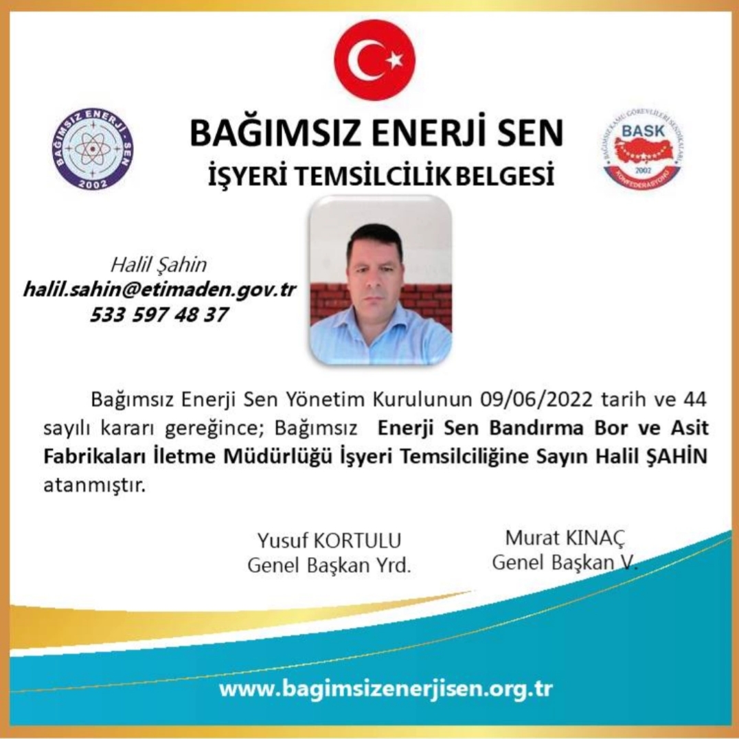 Sendikamız adına Eti Maden İşletmeleri Genel Müdürlüğü Bandırma Bor ve Asit Fabrikaları İşletme Müdürlüğünde sendikal faaliyetleri yürütmek üzere, Sendika İşyeri Temsilcisi olarak Halil ŞAHİN yetkilendirilmiştir.