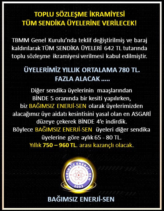 Böylece BAĞIMSIZ ENERJİ-SEN üyeleri diğer sendika üyelerine göre aylık 65 – 80 TL. Yıllık 750 – 960 TL. arası kazançlı olacak.