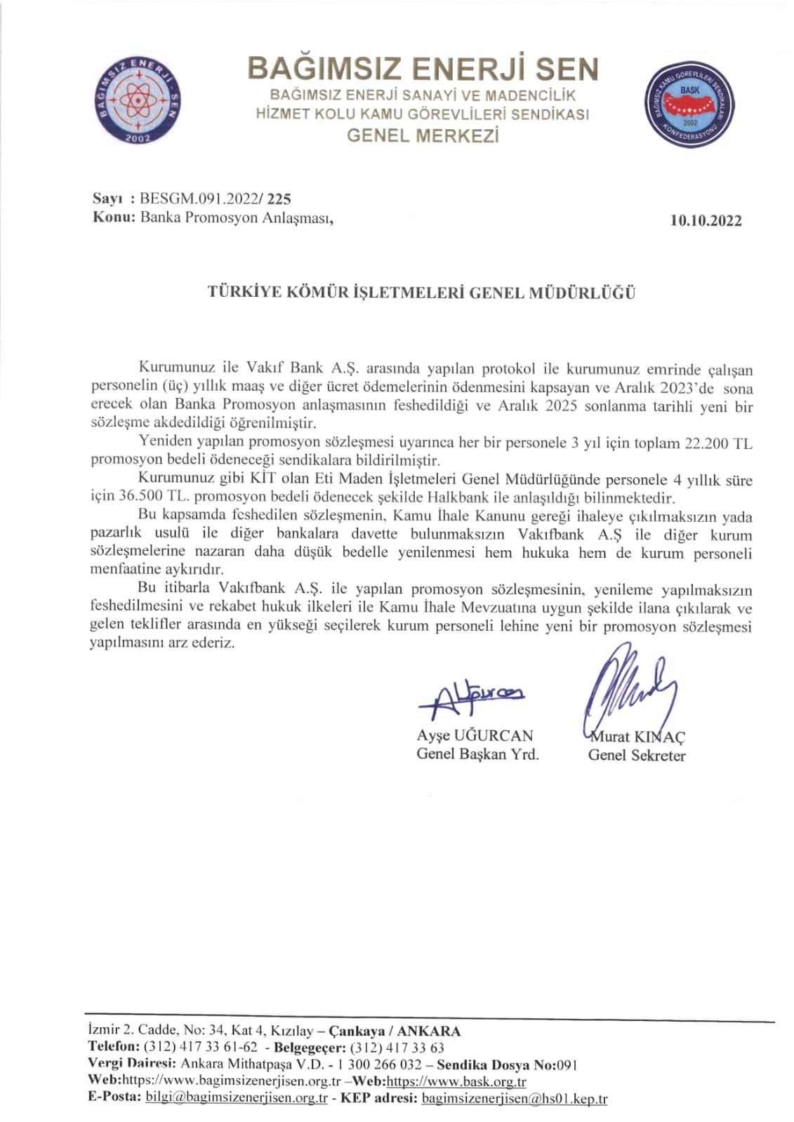 Türkiye Kömür İşletmeleri Genel Müdürlüğü nezdinde banka promosyonu talep yazımız.