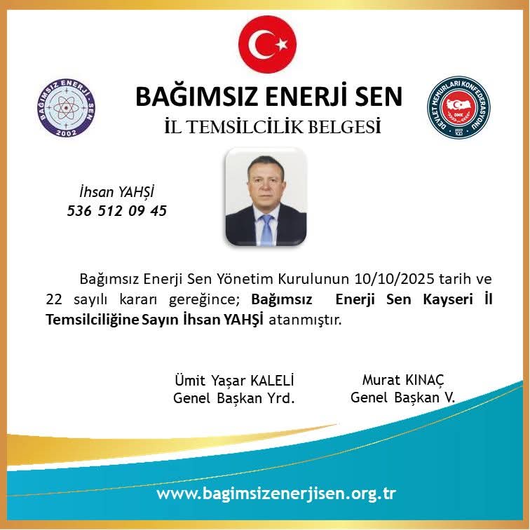 Kayseri ili genelinde etkin görev alarak bağımsız sendikacılık konusunda sendikamız adına faaliyet yürütmek üzere Milli Savunma Bakanlığı Akaryakıt NATO Pol Tesisleri İşletme Başkanlığı Doğu Bölge Müdürlüğü Kayseri İşletme Müdürlüğünde çalışmakta olan değerli üyemiz İhsan YAHŞİ; Bağımsız Enerji Sen Yönetim Kurulunun 10 Ekim 2025 tarih ve 22 sayılı kararı ile Bağımsız Enerji Sen Kayseri İl Temsilcisi olarak atanmıştır.