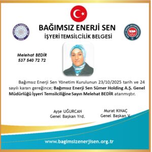 Bağımsız Enerji Sen Sümer Holding A.Ş. Genel Müdürlüğü İşyeri Temsilcisi olarak Melahat BEDİR yetkilendirildi.