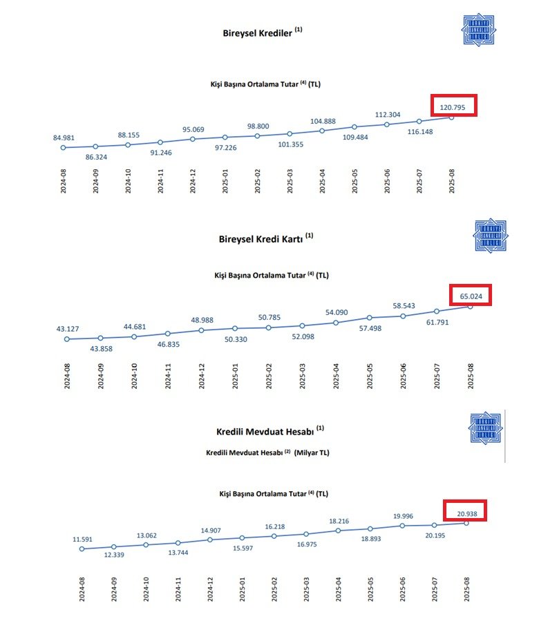 Türkiye Bankalar Birliği Risk Merkezinin https://www.riskmerkezi.org/istatistiki-raporlar/2541 linkinde yer alan Ekim 2025 Ayı Risk Merkezi Aylık Bültenine bakıldığında, ortalama 40 Milyon kişinin bankalara borçlandığı, fert başına ortalama 125.748 TL bireysel kredi, 66.983 TL kredi kartı ve 22.423 TL kredili mevduat olmak üzere fert başına ortalama toplam borç 215.154 TL görülüyor.