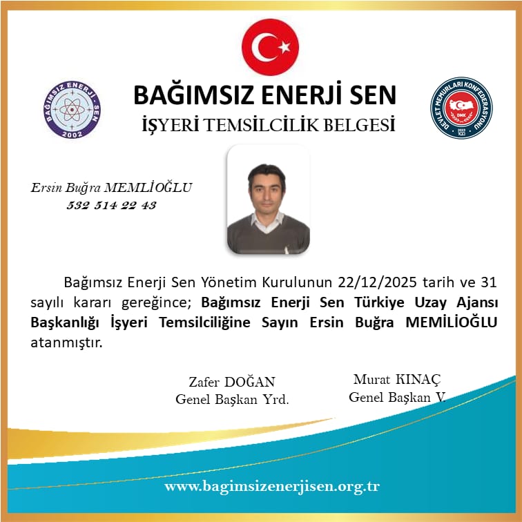 Bağımsız Enerji Sen Türkiye Uzay Ajansı Başkanlığı İşyeri Temsilcimiz Ersin Buğra MEMİLİOĞLU atanmıştır.