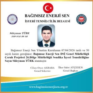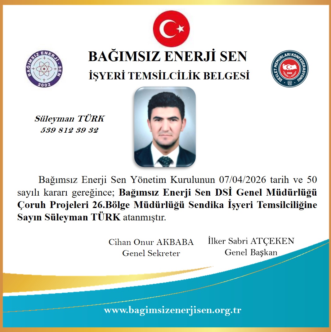 Bağımsız Enerji Sen DSİ Çoruh Projeleri 26. Bölge Müdürlüğü İşyeri Temsilcimiz Süleyman TÜRK yetkilendirilmiştir.