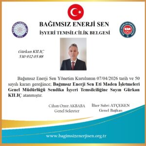 Eti Maden İşletmeleri Genel Müdürlüğünde etkin görev alarak bağımsız sendikacılık konusunda sendikamız adına faaliyet yürütmek üzere Eti Maden İşletmeleri Genel Müdürlüğünde Uzman ünvanında çalışmakta olan değerli üyemiz Gürkan KILIÇ; Bağımsız Enerji Sen Yönetim Kurulunun 7 Nisan 2026 tarih ve 50 sayılı kararı ile Bağımsız Enerji Sen Eti Maden İşletmeleri Genel Müdürlüğü İşyeri Temsilcisi olarak atanmıştır.