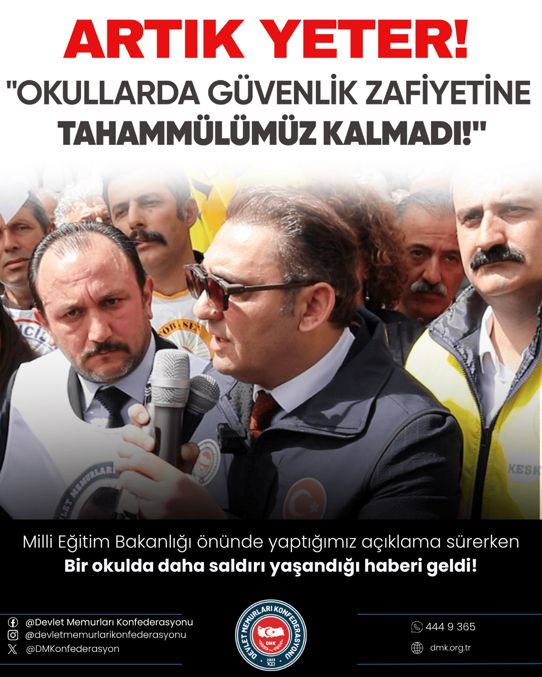 Devlet Memurları Konfederasyonu olarak; eğitim çalışanlarımızın ve öğrencilerimizin güvenliğini tehdit eden her türlü ihmale karşı durduğumuzu ifade ediyor, yetkilileri ivedilikle gerekli adımları atmaya davet ediyoruz.