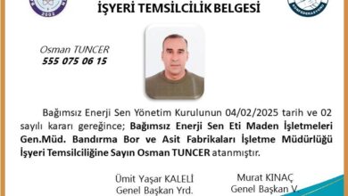 Bağımsız Enerji Sen Eti Maden İşletmeleri Genel Müdürlüğü Bandırma Bor ve Asit Fabrikası Müdürlüğü İşyeri Temsilcimiz Osman TUNCER atanmıştır.