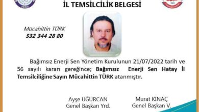 Bağımsız Enerji Sen Sanayi ve Teknoloji Bakanlığı Kütahya Sanayi ve Teknoloji İl Müdürlüğü Sendika İşyeri Temsilcisi Veysel YATGIN atanmıştır