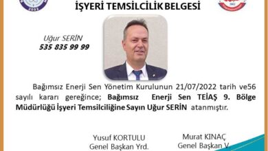 Sendikamız adına Türkiye Elektrik İletim A.Ş. 9. Bölge Müdürlüğünde sendikal faaliyetleri yürütmek üzere, Sendika İşyeri Temsilcisi olarak Uğur SERİN yetkilendirilmiştir.…