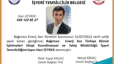 Bağımsız Enerji Sendikası TKİ Silopi Koordinasyon ve Takip Müdürlüğü İşyeri Temsilcimiz Hacı ZEYREK atanmıştır