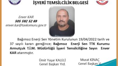 Bağımsız Enerji Sendikası TTK Armutçuk Taşkömürü İşletme Müessesesi Müdürlüğü İşyeri Temsilcimiz Enver KAR atanmıştır
