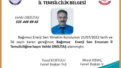 Bağımsız Enerji Sen Erzurum İl Temsilcimiz Vehbi DİKİLİTAŞ atanmıştır