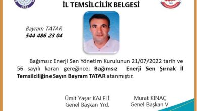 Bağımsız Enerji Sen Şırnak İl Temsilcimiz Bayram TATAR atanmıştır