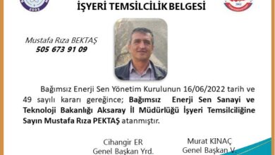 Bağımsız Enerji Sendikası Sanayi ve Teknoloji Bakanlığı Aksaray İl Müdürlüğü İşyeri Temsilcimiz Mustafa Rıza PEKTAŞ atanmıştır