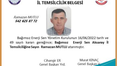 Bağımsız Enerji Sen Aksaray İl Temsilcimiz Ramazan MUTLU atanmıştır.