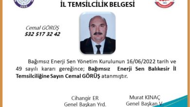 Bağımsız Enerji Sen Balıkesir İl Temsilcimiz Cemal GÖRÜŞ atanmıştır.