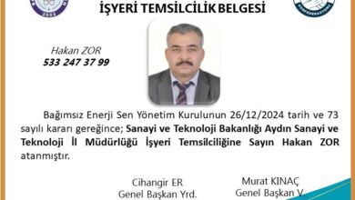 Bağımsız Enerji Sen Aydın Sanayi ve Teknoloji İl Müdürlüğü İşyeri Temsilcimiz Hakan ZOR atanmıştır.