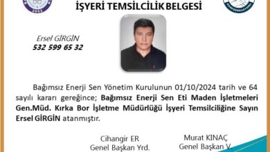 Bağımsız Enerji Sen Eti Maden İşletmeleri Genel Müdürlüğü Kırka Bor İşletme Müdürlüğü İşyeri Temsilcimiz Ersel GİRGİN atanmıştır.