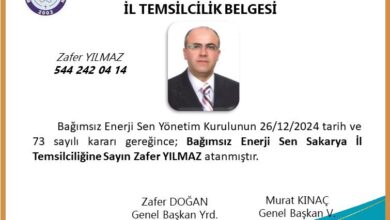 Bağımsız Enerji Sen Sakarya İl Temsilcimiz Zafer YILMAZ atanmıştır.