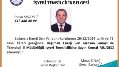 Bağımsız Enerji Sen Giresun Sanayi ve Teknoloji İl Müdürlüğü İşyeri Temsilcimiz Cemal MÜJDECİ atanmıştır.