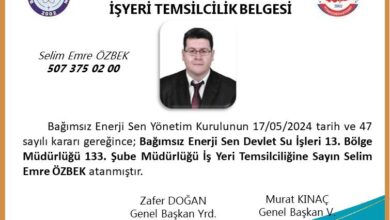Bağımsız Enerji Sen DSİ 13. Bölge Müdürlüğü 133. Şube Müdürlüğü Sendika İşyeri Temsilcisi Selim Emre ÖZBEK atanmıştır