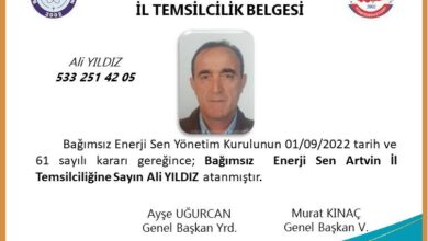 Bağımsız Enerji Sen Artvin İl Temsilcimiz Ali YILDIZ atanmıştır.