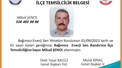 Bağımsız Enerji Sen Bandırma İlçe Temsilcimiz Mikail ŞENOL atanmıştır