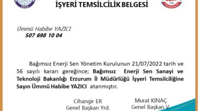 Bağımsız Enerji Sendikası Sanayi ve Teknoloji Bakanlığı Erzurum İl Müdürlüğü İşyeri Temsilcimiz Ümmü Habibe YAZICI atanmıştır