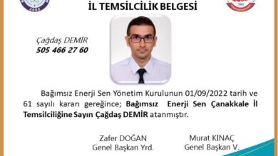 Bağımsız Enerji Sen Çanakkale İl Temsilcimiz Çağdaş DEMİR atanmıştır